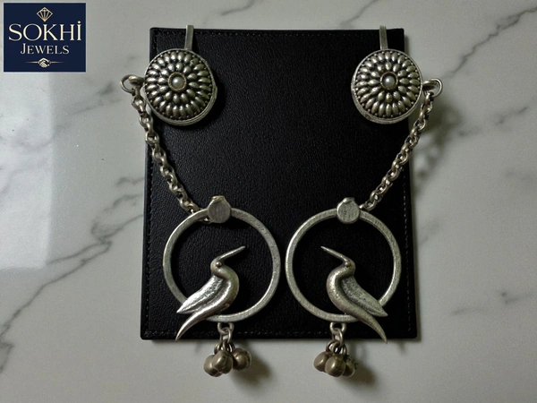 Sokhi Jewels Dual Chain Silver Replica Brooch with Bird & Floral Charms – Elegant Ethnic Earcuff Earrings Jhumar Accessory for Saree, Dupatta & Bridal Looks for Women & Girls