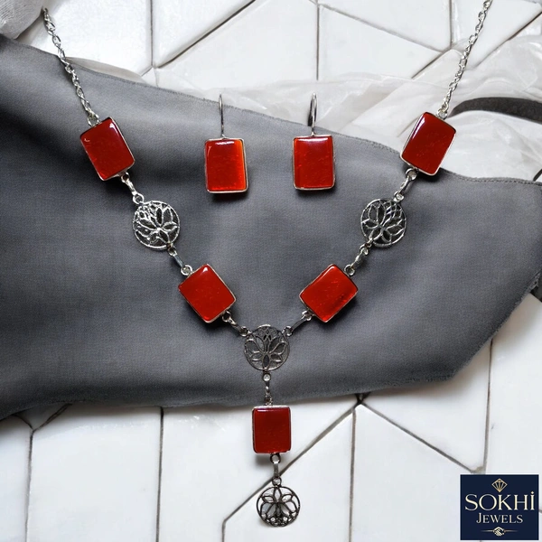 Sokhi Jewels Red Stone Necklace & Earrings Set – Antique Silver-Plated Floral Design for Festive & Ethnic Wear for Women & Girls