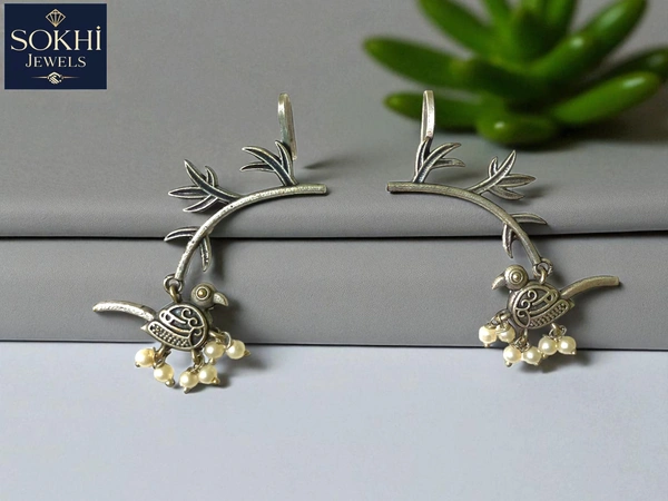SOKHI Jewels Silver Replica Handcrafted Bird-on-Branch Earrings with Earcuffs – Earrings with Pearl Drop Charms for Women & Girls